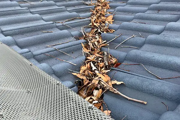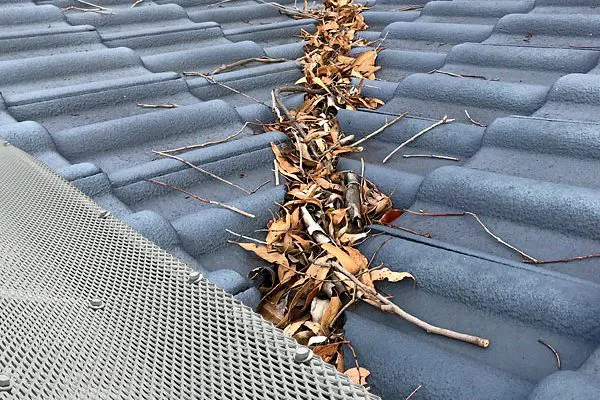 • Blocked valleys, spouting or downpipes with debris such as leaves, other plant matter or